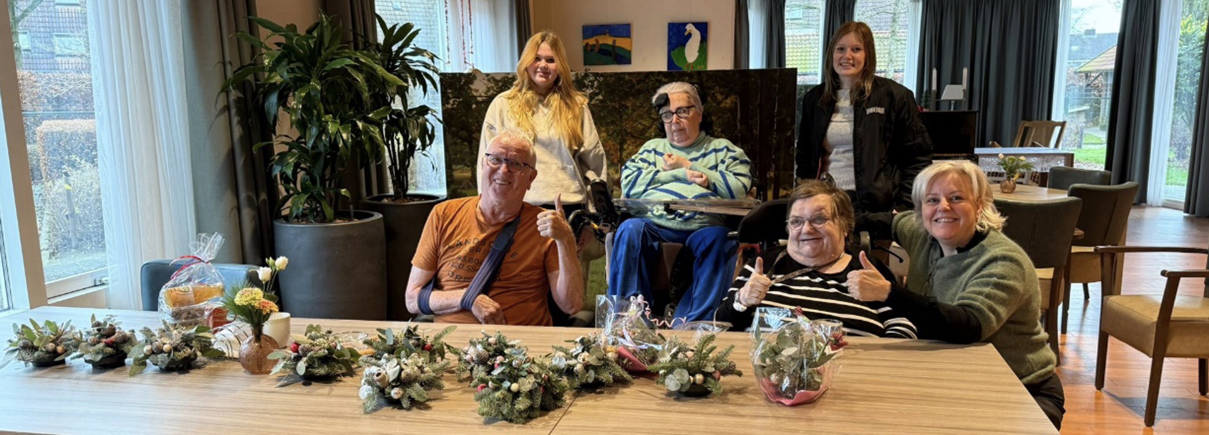 Twee leerlingen, Fleur en Sasha, brachten de kerststukjes persoonlijk naar Norschoten. Daar werden ze met een glimlach in ontvangst genomen. De bewoners en medewerkers waren blij verrast en waardeerden het gebaar enorm.