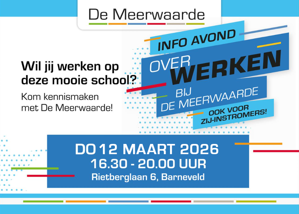 Speelt bij jou de gedachte om een overstap of carrièreswitch te maken naar of binnen het voorgezet onderwijs door je hoofd? En wil jij je oriënteren op wat zo’n switch inhoudt? Welke opleiding moet je volgen, wat zijn de kosten in tijd en geld, wat houdt werken op onze school in en gaat deze switch jou écht gelukkig maken!? Dat zijn vragen die beantwoord worden tijdens onze avond Over werken bij De Meerwaarde.